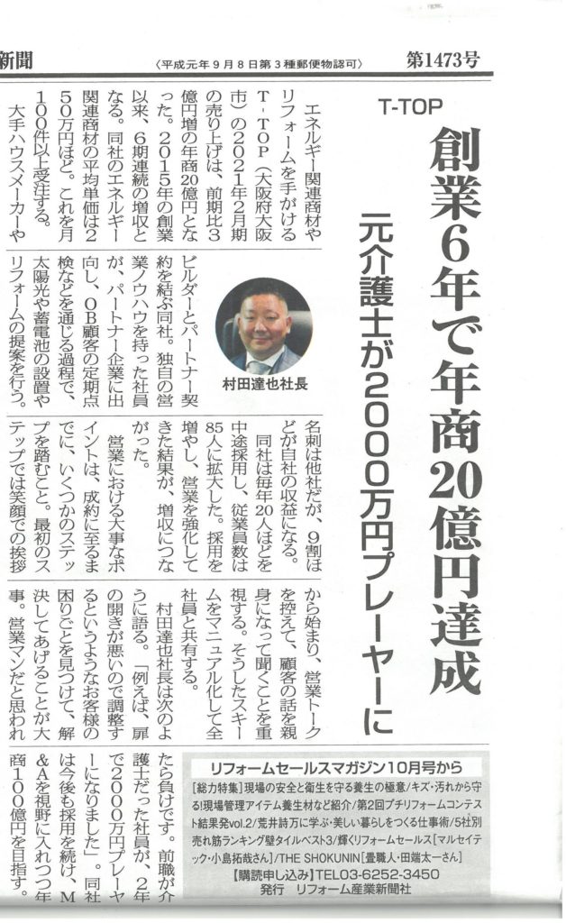 9/20発刊のリフォーム産業新聞に弊社の業績に関して掲載されました。